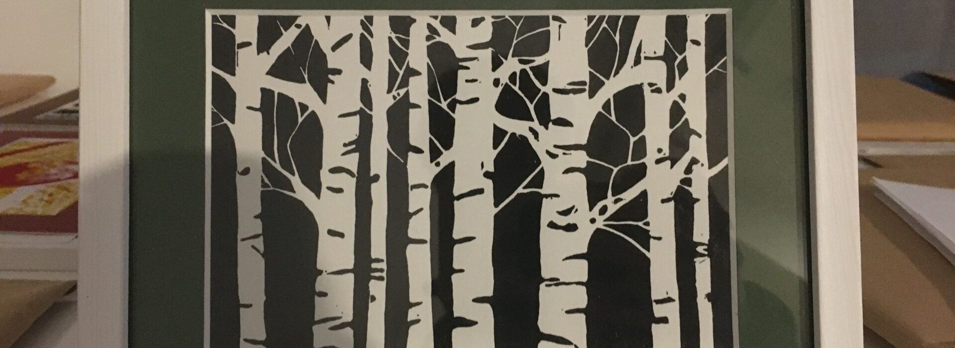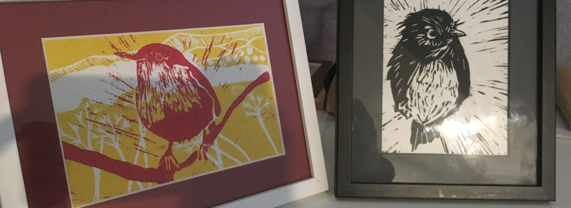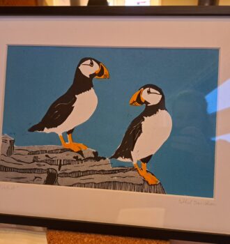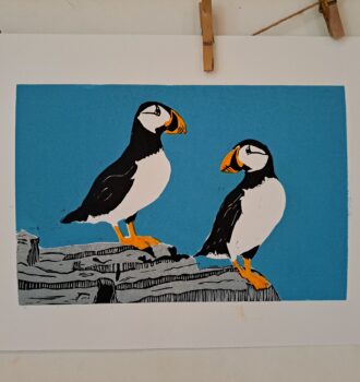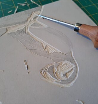 J’ai débuté avec un kit de chez Esdee (qui fonctionne d’ailleurs très bien). Au départ, je recopiais des motifs trouvés sur internet, avant de me lancer progressivement dans des créations plus personnelles. Une fois le motif gravé, il faut encrer la plaque de lino et imprimer sur le papier. Au début, j’utilisais l’outil fourni dans le kit, mais pour les macareux, j’ai travaillé avec une petite presse, plus sûre et plus confortable.